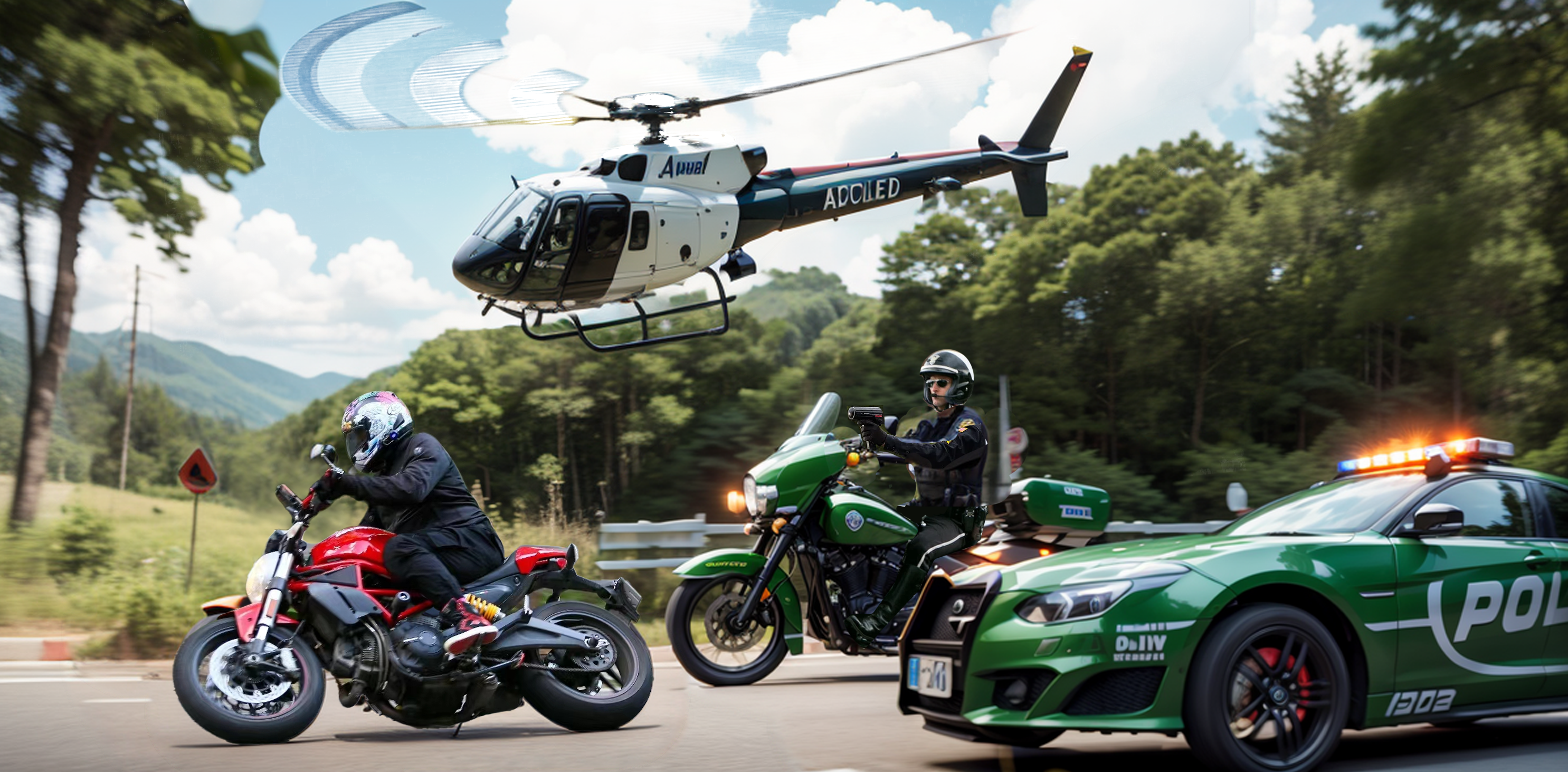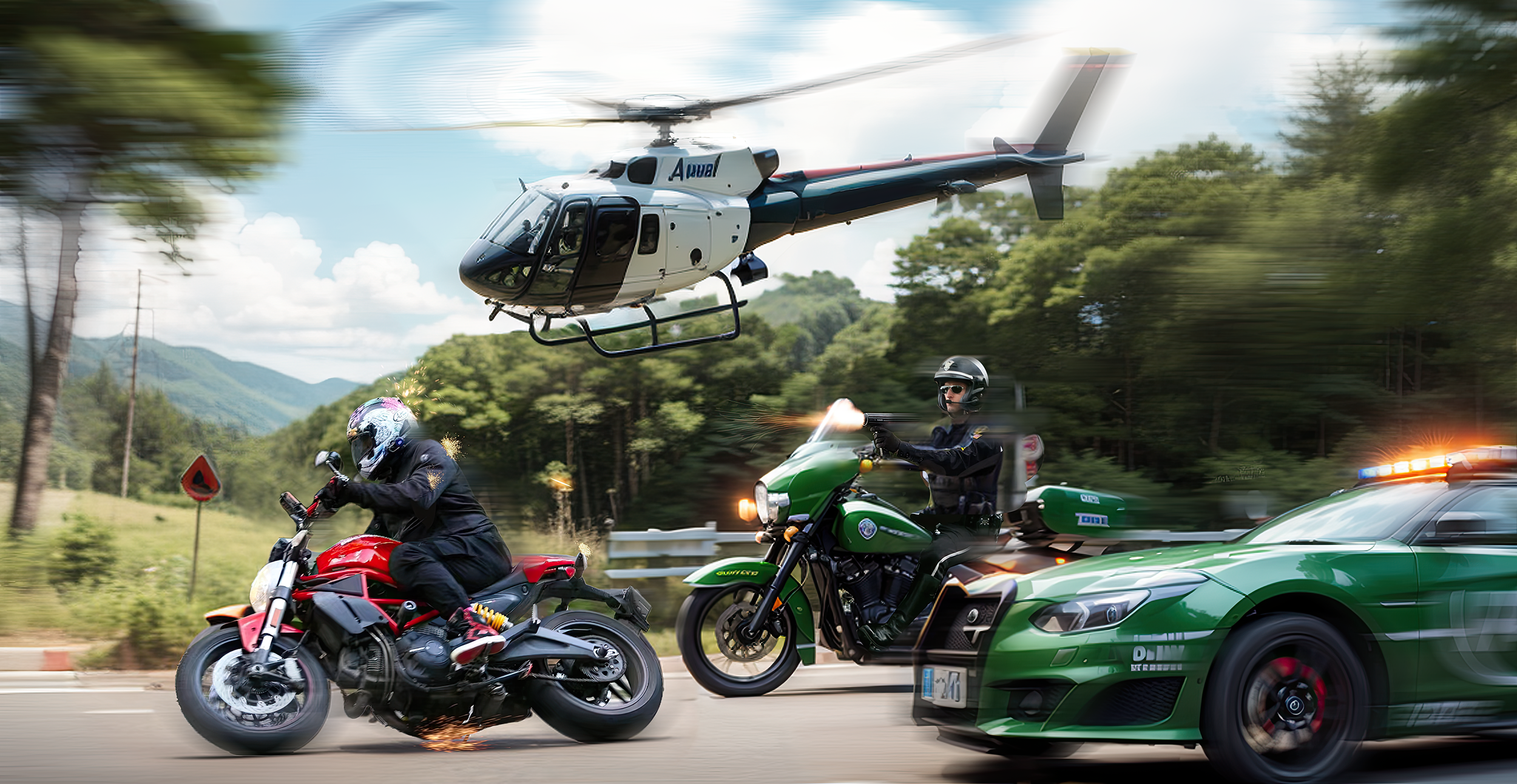 在场景中添加一个警车的轮廓,使用Photoshop的形状工具或插图工具绘制。通过添加闪烁的警灯和适当的阴影效果,强化追逐场景的紧张感。 最后,利用StableDiffusion和Photoshop的渲染和调色功能,调整整个场景的色调和光影效果。增加一些模糊和运动效果,使摩托车和背景更加融合,并强化追逐的动感。 经过一番调整和细节修饰,我们成功地完成了图片创作。